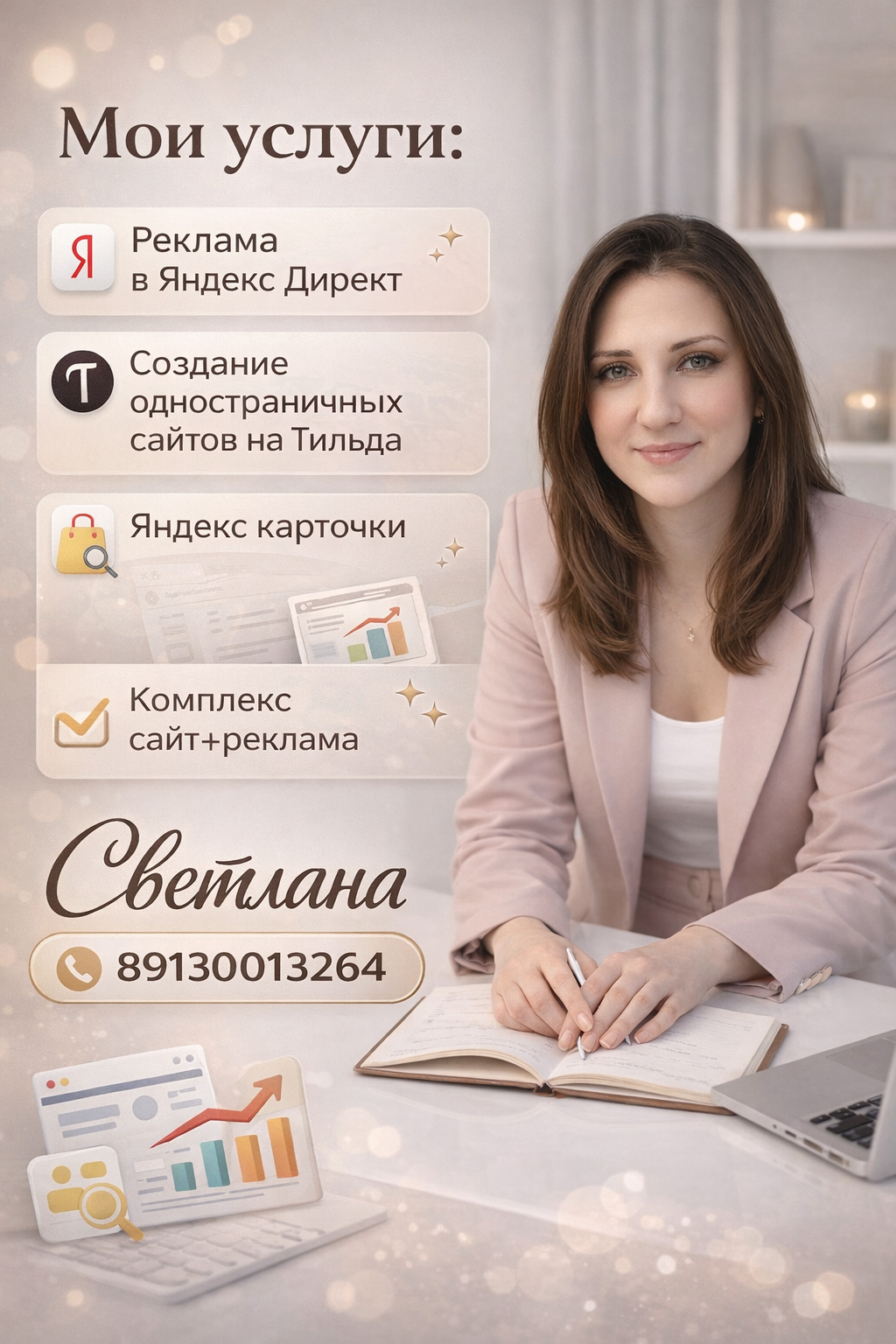 Я помогаю бизнесу настраивать рекламу в Яндекс Директ, создавать продающие одностраничные сайты на платформе Tilda и настраивать карточки товаров в Яндекс. Такой комплекс позволяет не только привлечь посетителей, но и превратить их в потенциальных клиентов.